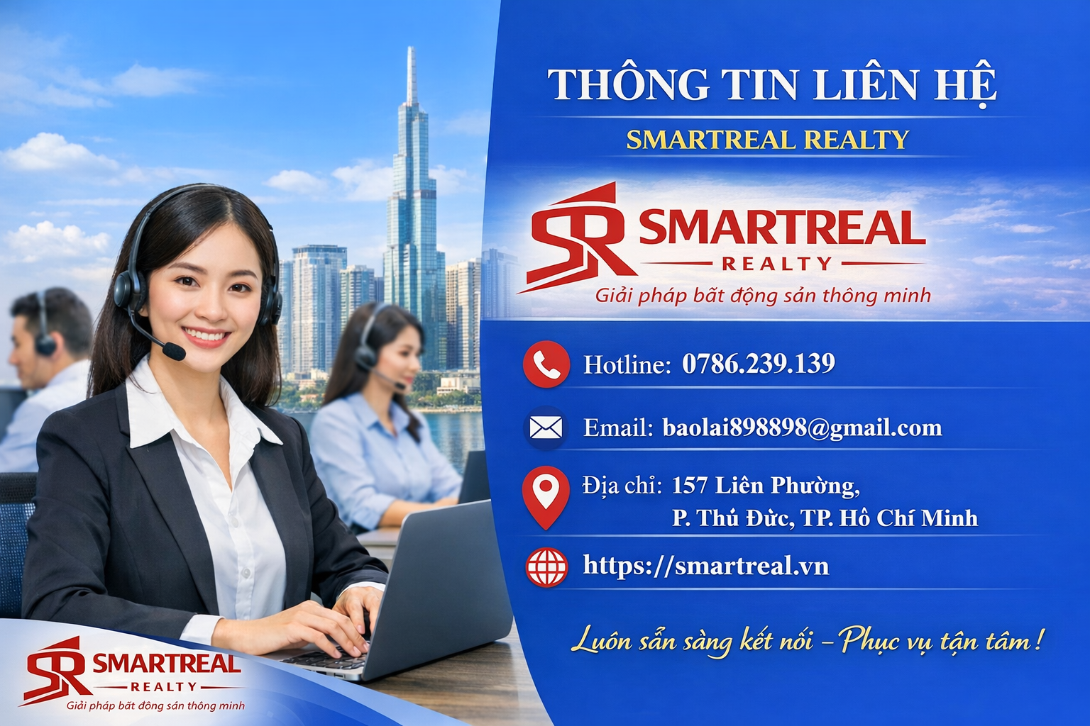 Quý khách có thể liên hệ trực tiếp qua hotline hoặc email để được tư vấn chi tiết và cập nhật những cơ hội đầu tư tiềm năng nhất từ SmartReal Realty. Chúng tôi luôn sẵn sàng phục vụ bạn mọi lúc, mọi nơi.